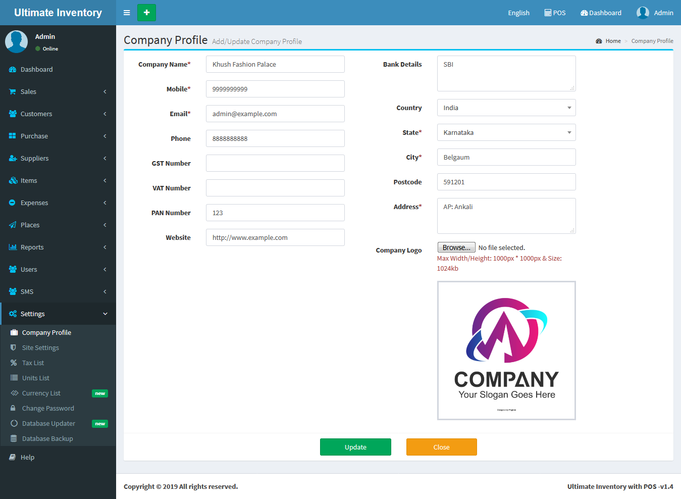 You can update the company profile information's like Company name, Phone, Mobile, Email, GST Number, VAT Number, PAN Number, Bank Details, Website link, Country, State, Postcode,Address and Invoice Logo.