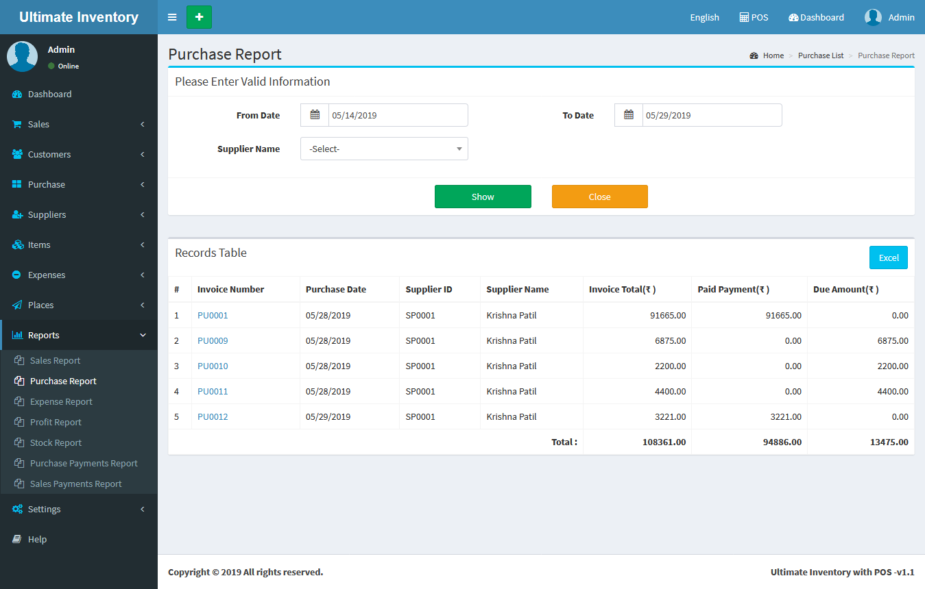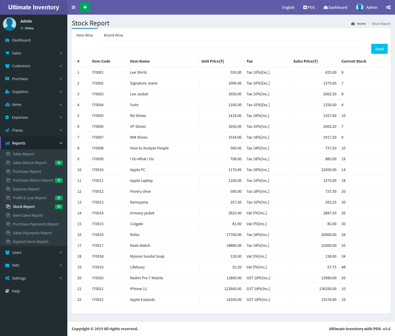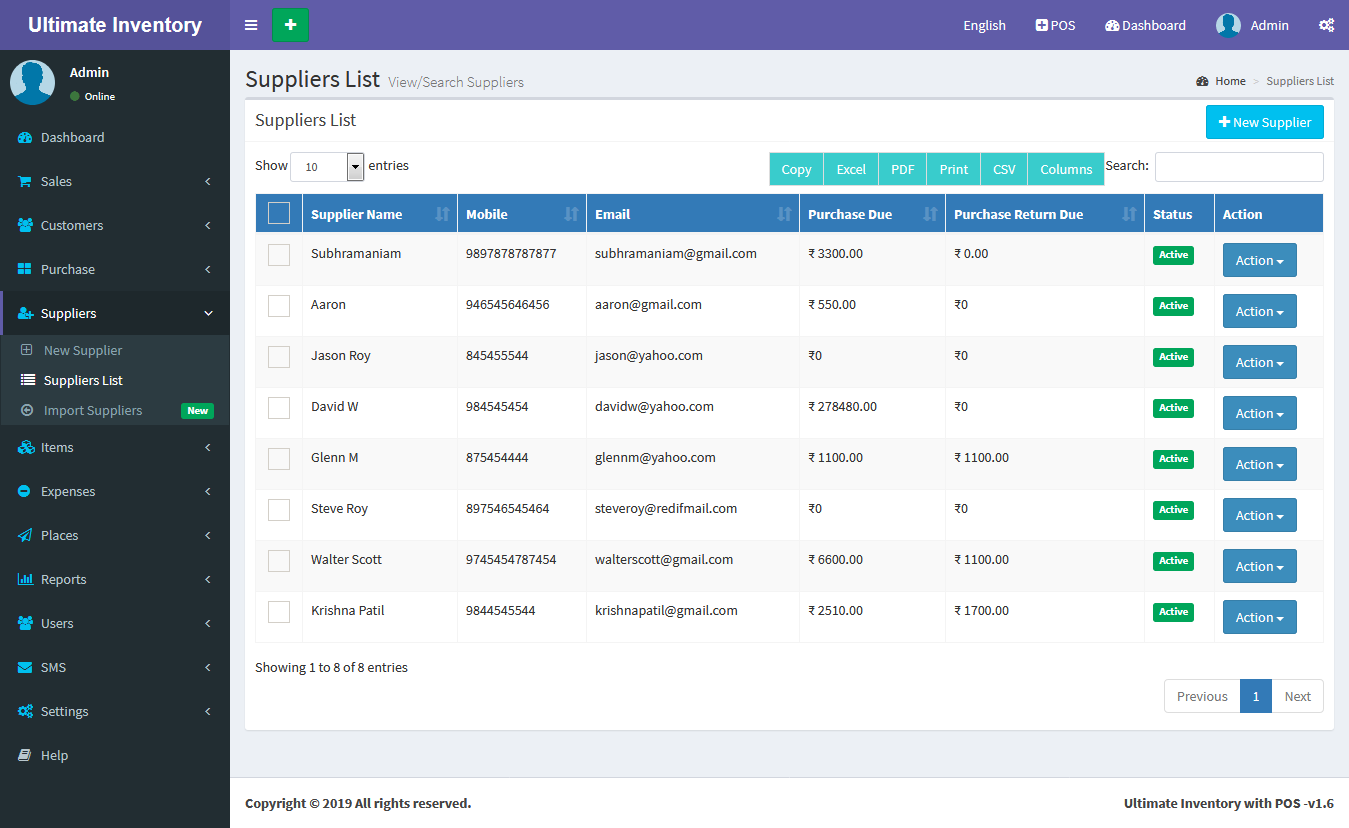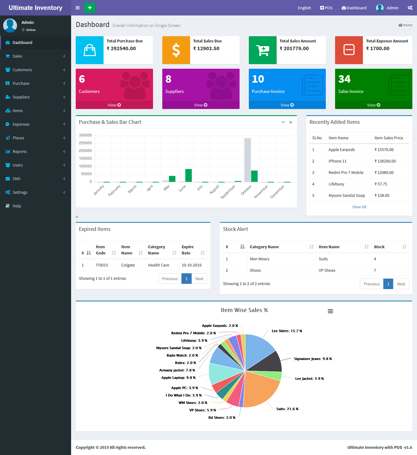 Inventory with POS is a web application software user can track Items & Stock Items, Manage Suppliers, Manage Customers, Items Categories, Sales, Purchase, Manage users and get all the reports which are require to your office and many more features.