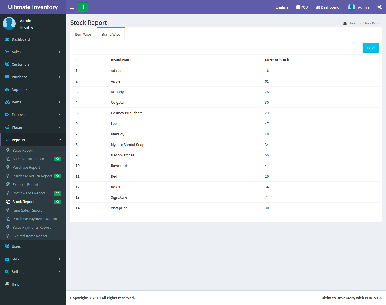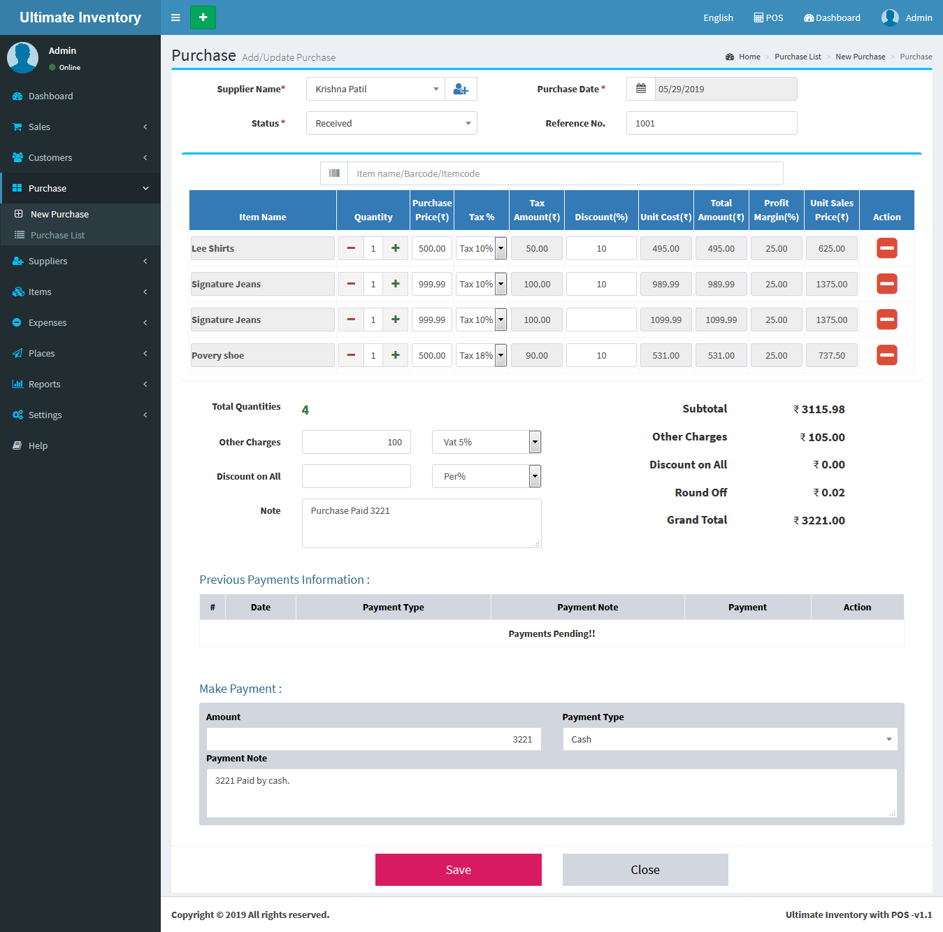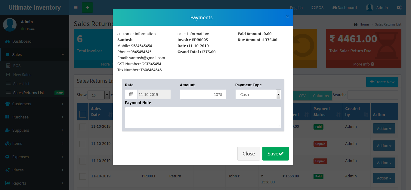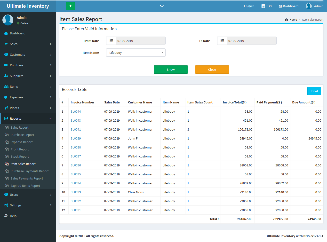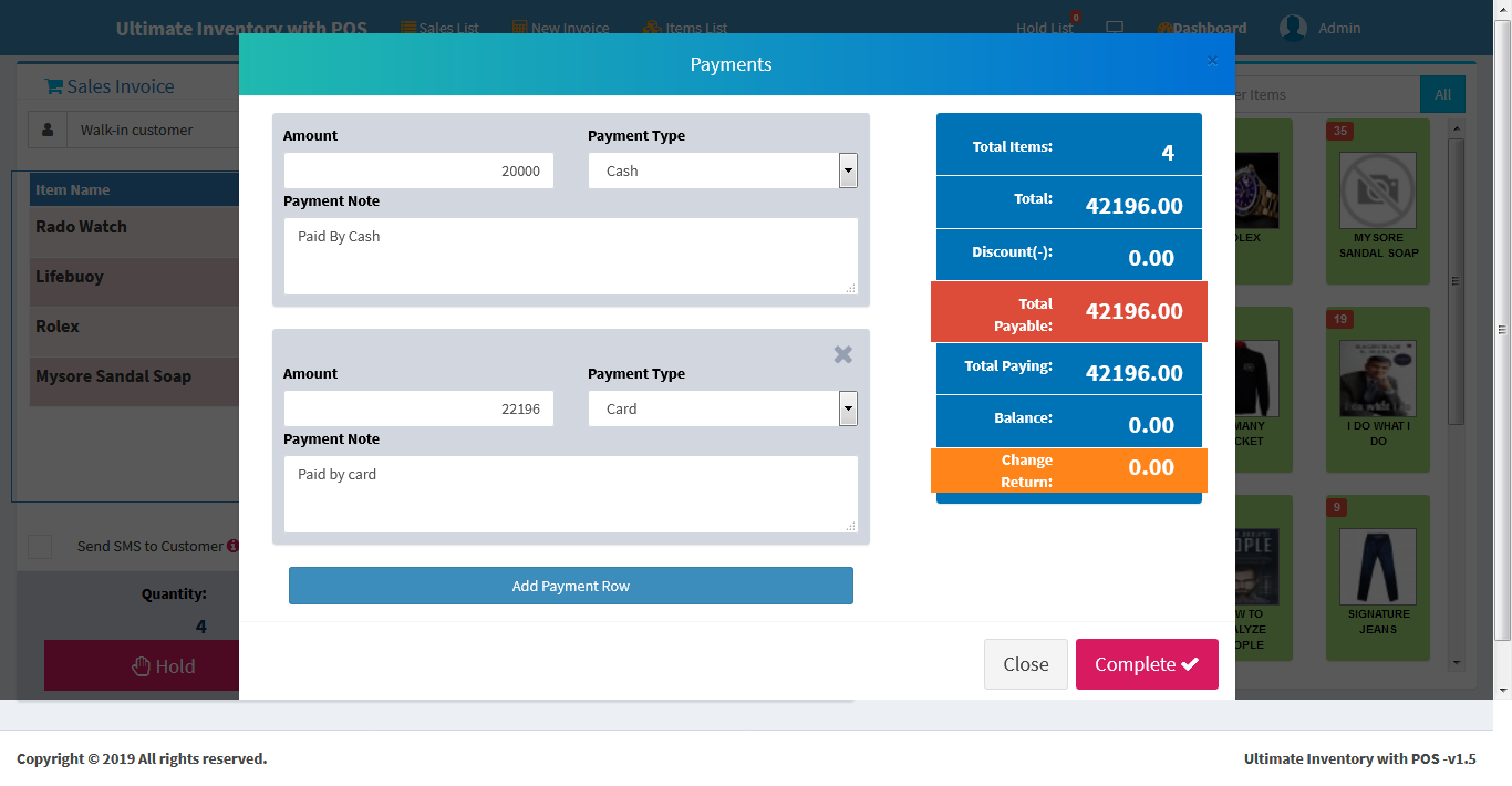 Inventory with POS is a web application software user can track Items & Stock Items, Manage Suppliers, Manage Customers, Items Categories, Sales, Purchase, Manage users and get all the reports which are require to your office and many more features.