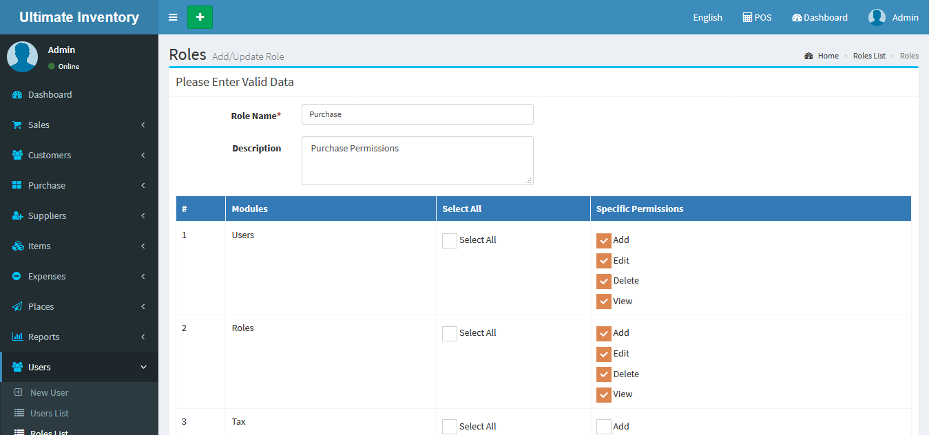 Adding a Role it's a very easy task. Enter Role name, Description(Optional field), Select Persmissions for that role and click on Save button.