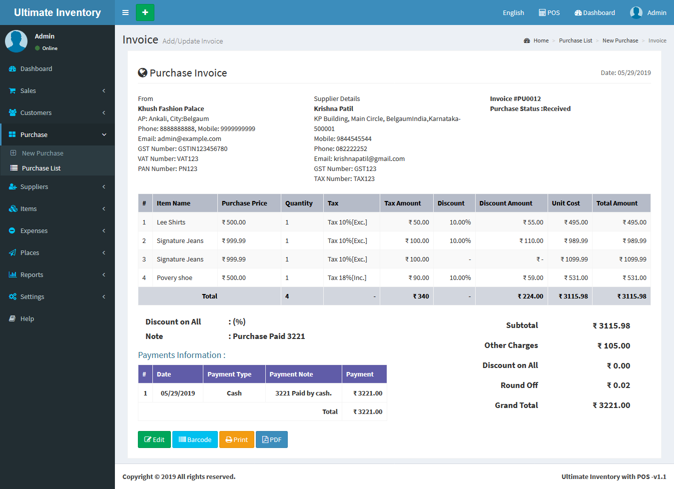You can view the all the added Purchases list and you can Purchases list by Delete & Edit actions.