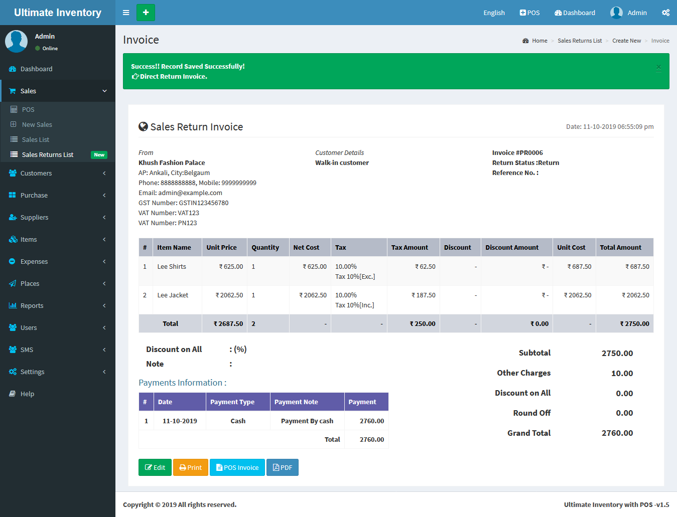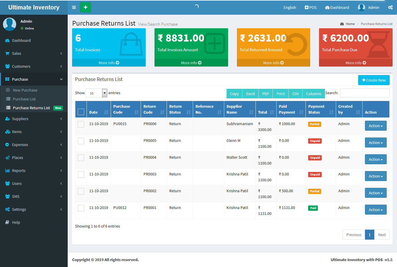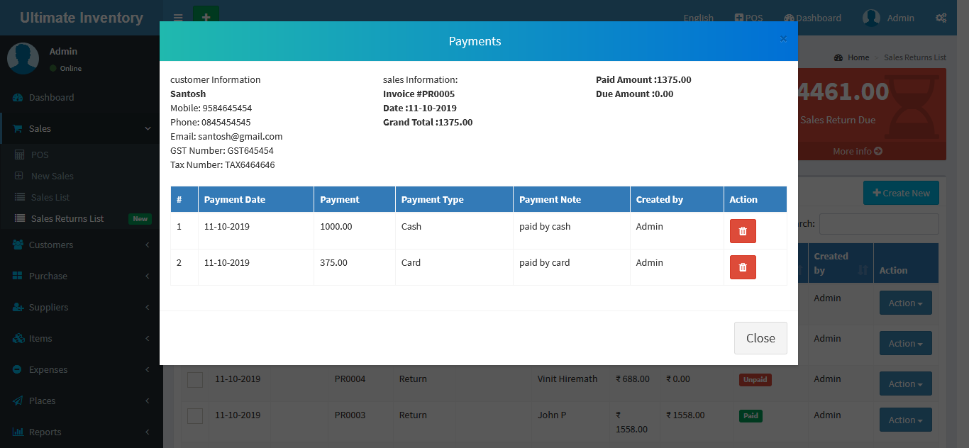 You can view the all the added Purchases Returns list and you can Purchases Return list by Delete & Edit actions.