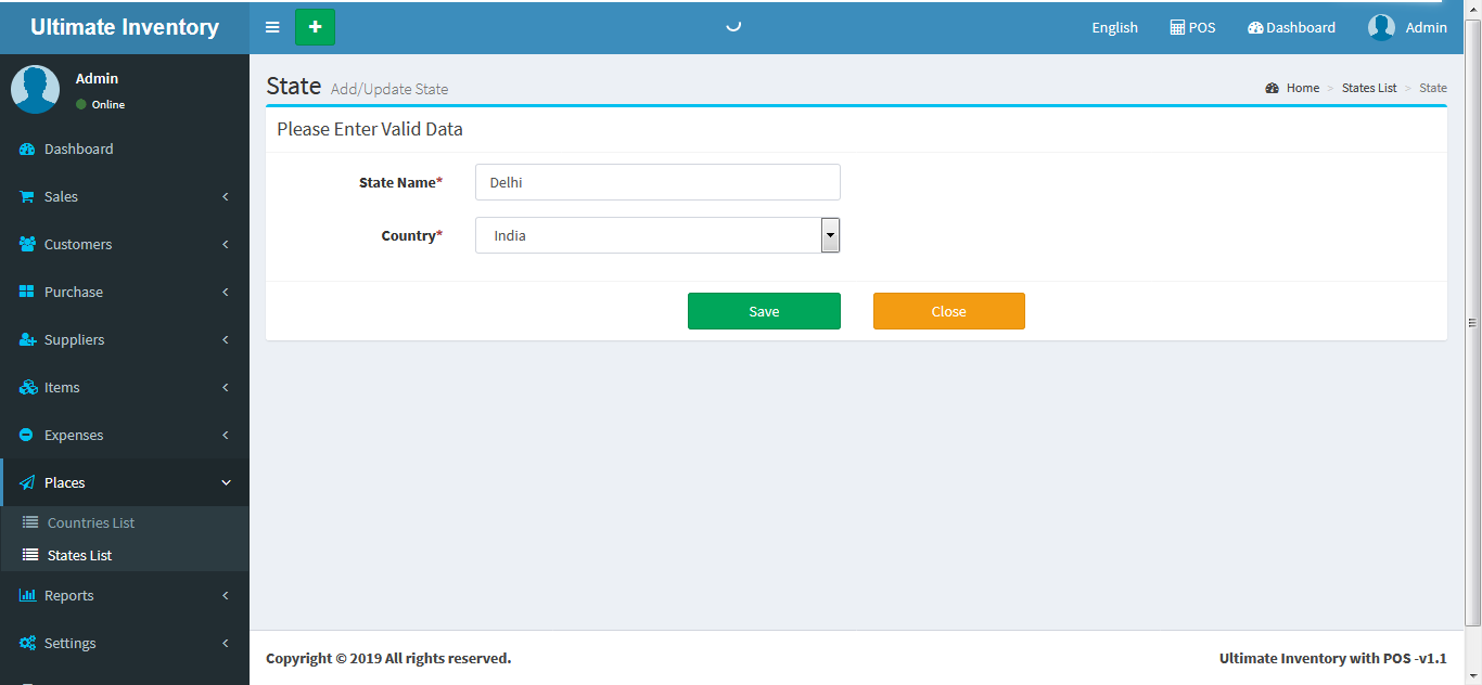 Adding a State it's a very easy task. Enter State name, select country name and click on Save button.