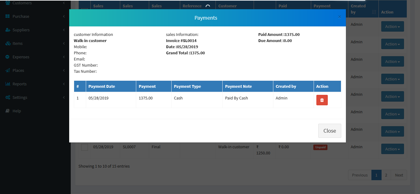 Purchase -> Purchase List -> Click on Action Button -> Click on View Payments